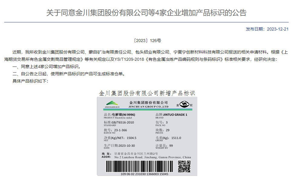 12月21日,據上海期貨交易所一則《關于同意金川集團股份有限公司等4家企業增加產品標識的公告》稱,金川集團股份有限公司即日起使用新產品標識的產品(品名:電解鎳NI9996)可生成標準倉單。